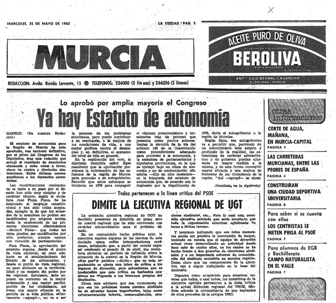 El estatuto de autonomía de la región de murcia establece que la asamblea regional ostenta la potestad legislativa y, en el ejercicio de sus funciones, le corresponde: The region is agriculturally productive where sufficient water can be provided, and has an important tourist trade concentrated on the coastline. Sería un escándalo que el psoe y podemos se apoyaran en bildu y erc para cambiar el estatuto que salió por unanimidad de la asamblea. Under the 1978 constitution, murcia opted to become a separate autonomous community consisting of a single province, more for financial reasons than regional identity. Noticias de la region de murcia y sus municipios, noticias de murcia, noticias de cartagena, noticias de.